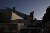 Firefighter walk down a ladder outside a building where a plane crash occurred Thursday, Jan. 2, 2025, in Fullerton, Calif. (AP Photo/Kyusung Gong)