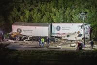 Emergency crews respond to the scene of a fatal crash on Interstate 81 near Chambersburg, Pa., late Wednesday, Aug. 9, 2023. A recreational vehicle blew a tire on the interstate highway in , crossed the median and collided head-on with a tractor-trailer, killing four people in the RV and the truck driver, authorities said. (WPMT/FOX43 via AP)