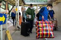 Residents are assisted by the Government Quick Response Unit as they return to their homes to collect belongings after the fire at Wang Fuk Court, a residential estate in the Tai Po district of Hong Kong's New Territories on Wednesday, Dec 3, 2025. (AP Photo/Chan Long Hei)
