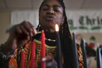 FILE - Ayodele Kofie lights the first two candles of Kwanzaa holiday that represent the days for unity and self-determination while presenting a Kwanzaa ceremony for members of the Lewis Center for Senior Citizens in Memphis, Tenn., Dec. 27, 2013. (Kyle Kurlick/The Commercial Appeal via AP, File)