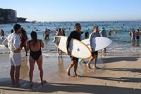 Surfers and swimmers head out to the ocean as a tribute following Sunday's shooting at Bondi Beach, in Sydney, Friday, Dec. 19, 2025. (AP Photo/Steve Markham)