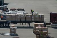A worker unloads humanitarian aid at the Norman Manley International Airport in Kingston, Jamaica, Saturday, Nov. 1, 2025, in the aftermath of Hurricane Melissa. (AP Photo/Matias Delacroix)