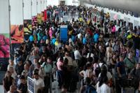 Passengers check in at the Norman Manley International Airport in Kingston, Jamaica, Saturday, Nov. 1, 2025, in the aftermath of Hurricane Melissa. (AP Photo/Matias Delacroix)
