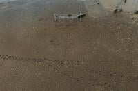 Mud covers a soccer goal in Montego Bay, Jamaica, Friday, Oct. 31, 2025, in the aftermath of Hurricane Melissa. (AP Photo/Matias Delacroix)