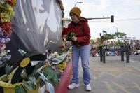 Earlier in the day, hundreds of flowers and signs swayed in the wind between towering statues of fists at the square. Kendrick White and Georgio Wright, two Black men, said they visit the site every day and lead “pilgrimage guides” — or tours — to spread awareness about what happened.