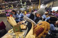 Volunteer Valerie Caparino from La Mirada, Calif. helps to decorate a giant corn cob for use on the OneLegacy Donate Life Rose Parade Float at Fiesta Parade Floats in Irwindale, Calif. on Tuesday, Dec. 26, 2023. Decorator's week has officially started with the Rose Parade less than a week away. All week long, thousands of volunteers will be hard at work at Fiesta Parade Floats to decorate the floats. (AP Photo/Richard Vogel)