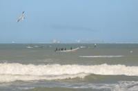With the Grand Tortue Ahmeyim (GTA) natural gas extraction platform in the background, local fishermen fish off the coast of Saint-Louis, Senegal, Thursday, March 13, 2025. (AP Photo/Sylvain Cherkaoui)