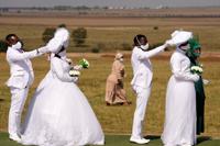 Groomsmen shield their brides from the sun as they queue for an Easter mass wedding at The International Pentecost Holiness Church in Heidelberg, South Africa, April 20, 2025. (AP Photo/Themba Hadebe, File)