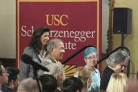 Members of the California Citizens Redistricting Commission, from left, Jodie Filkins, Peter Yao, Cynthia Dai, and Jeanne Raya, are introduced by former California Gov. Arnold Schwarzenegger during a talk with University of Southern California interim president Beong-Soo Kim on a conversation on democracy and Schwarzenegger's opposition to Proposition 50, a California ballot measure to redraw U.S. House maps to boost Democrats, at the USC campus in Los Angeles, Monday, Sept. 15, 2025. (AP Photo/Damian Dovarganes)