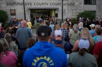 People gather outside the Humphreys County Courthouse for a candlelight vigil honoring the victims of a blast at an explosives plant, Accurate Energetic Systems, Sunday, Oct. 12, 2025, in Waverly, Tenn. (AP Photo/George Walker IV)