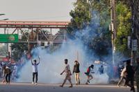 Protesters throw stones and shout slogans during a standoff with police outside the demolished residence of Sheikh Mujibur Rahman, Bangladesh's former leader and the father of the country's ousted Prime Minister Sheikh Hasina after the verdict against Hasina, in Dhaka, Bangladesh, Monday, Nov. 17, 2025. (AP Photo/ Rajib Dhar)