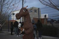 Fans of Benito the giraffe visit Central Park zoo prior to his transfer to a new habitat in Ciudad Juarez, Mexico, Sunday, Jan. 21, 2024. After a campaign by environmentalists, Benito left Mexico's northern border and its extreme weather conditions Sunday night and headed for a conservation park in central Mexico, where the climate is more akin to his natural habitat and already a home to other giraffes. (AP Photo/Christian Chavez)