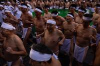 Participants prepare to bathe in ice-cold water to purify their souls and pray for good health during a New Year's ritual at Teppozu Inari Shrine in Tokyo, Sunday, Jan. 11, 2026. (AP Photo/Louise Delmotte)
