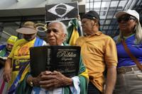 A supporter holding a Bible waits for the arrival of former President Jair Bolsonaro at a hospital, after he was temporarily allowed out of house arrest for medical treatment, in Brasilia, Brazil, Sunday, Sep. 14, 2025. (AP Photo/Eraldo Peres)