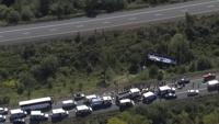 News helicopter footage showed tire tracks on the roadway and a path of ripped-up grass and shrubs on the embankment. Hochul said the bus tumbled 50 feet down the steep slope in a wide median between the eastbound and westbound lanes of the highway. The bus came to rest on its left side, its roof warped. A ladder allowed rescuers to reach the windows.