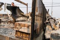 Resident Andres Garrido pushes a wheelbarrow with gas cylinders burned when wildfires destroyed homes in Tome, Chile, Monday, Jan. 19, 2026. (AP Photo/Javier Torres)