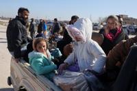 Displaced Syrian children and women ride in the back of a truck near a humanitarian crossing declared by the Syrian army in the village of Hamima, in the eastern Aleppo countryside, near the front line with the Kurdish-led Syrian Democratic Forces in Deir Hafer, Syria, Thursday, Jan. 15, 2026. (AP Photo/Omar Albam)