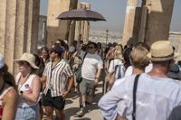 FILE - A man holds an umbrella as he and other tourists enter the ancient Acropolis hill during a heat wave, in Athens, Greece, July 13, 2023. A new study Tuesday, July 25, finds these intense and deadly hot spells gripping much of the globe in the American Southwest and Southern Europe could not have occurred without climate change. (AP Photo/Petros Giannakouris, File)