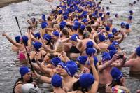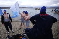 Some of 2461 polar swimmers get out of the water after breaking a world record for the largest polar bear dip at a lake in Most, Czech Republic, Saturday, March 1, 2025. (AP Photo/Petr David Josek)