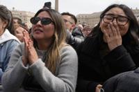Faithful get emotional as Pope Francis arrives at the end of the mass on Palm Sunday in St. Peter's Square at The Vatican, Sunday, April 13, 2025. (AP Photo/Gregorio Borgia)