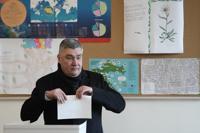 Croatia's President Zoran Milanovic prepares his ballot during a presidential election at a polling station in Zagreb, Croatia, Sunday, Dec. 29, 2024. (AP Photo/Darko Bandic)