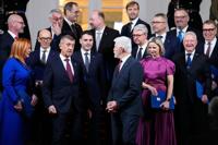 Czech Republic's President Petr Pavel, center, and Prime Minister Andrej Babis, center left, pose for a family photo with newly appointed government members at the Prague Castle in Prague, Czech Republic, Monday, Dec. 15, 2025. (AP Photo/Petr David Josek)