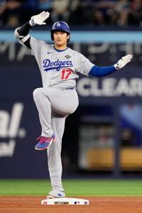 Los Angeles Dodgers' Shohei Ohtani celebrates a double against the Toronto Blue Jays during the eighth inning in Game 6 of baseball's World Series, Friday, Oct. 31, 2025, in Toronto. (AP Photo/Brynn Anderson)