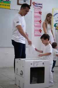 Ecuadorian President Daniel Noboa, accompanied by his family, votes in a referendum on whether to allow foreign military bases in the country and rewrite the constitution through a constituent assembly, in Olon, Ecuador, Sunday, Nov. 16, 2025. (AP Photo/Cesar Munoz)