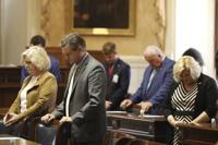 South Carolina senators pray before a special session to consider an abortion bill on Wednesday, Nov. 9, 2022, in Columbia, S.C. (AP Photo/Jeffrey Collins)