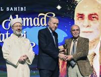 In this photo provided by the Turkish Presidency, Turkey's President Recep Tayyip Erdogan presents the "Benevolence and Kindness" award to former Syrian Army fighter pilot Ragheed Ahmad al-Tatari, right, in Ankara, Turkey, Thursday, March 13, 2025. (Turkish Presidency via AP)