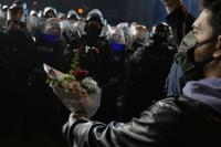 A protester offers flowers to riot police during a protest after Istanbul's Mayor Ekrem Imamoglu was arrested and sent to prison, in Istanbul, Turkey, Tuesday, March 25, 2025. (AP Photo/Khalil Hamra)