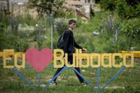 A man walks by a sign that reads "I love Bulboaca" outside the Castel Mimi, in Bulboaca, Moldova, Wednesday, May 31, 2023. Moldova will host the Meeting of the European Political Community on June 1, 2023. Preparations for a major summit of European leaders were still underway in Moldova on Wednesday, a sign of the Eastern European country’s ambitions to draw closer to the West and break with its Russian-dominated past amid the war in neighboring Ukraine. (AP Photo/Andreea Alexandru)