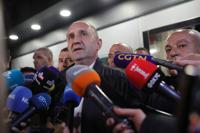 Former Bulgarian President Rumen Radev speaks to journalists after the polls closed in Sunday's election, in Sofia, Bulgaria, April 19, 2026. (AP Photo/Valentina Petrova)