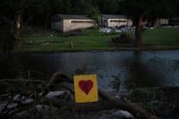 FILE - A broken heart sign is displayed near Camp Mystic July 8, 2025, after a flash flood swept through the area in Hunt, Texas. (AP Photo/Eli Hartman, File)