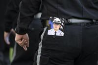A police officer carries a pamphlet dedicated to officer Richard Mendez at the Cathedral Basilica of Saints Peter and Paul in Philadelphia, Tuesday, Oct. 24, 2023. Mendez was shot and killed, and a second officer was wounded when they confronted people breaking into a car at Philadelphia International Airport, Thursday, Oct. 12, 2023, police said. (AP Photo/Joe Lamberti)