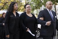 Alex Mendez, center, arrives for the viewing of her late husband, officer Richard Mendez, alongside their daughter Mia Mendez, left, at the Cathedral Basilica of Saints Peter and Paul in Philadelphia, Tuesday, Oct. 24, 2023. Mendez was shot and killed, and a second officer was wounded when they confronted people breaking into a car at Philadelphia International Airport on Oct. 12, 2023, police said. (AP Photo/Joe Lamberti)