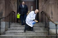 The stairs are cleaned ahead of a viewing for officer Richard Mendez at the Cathedral Basilica of Saints Peter and Paul in Philadelphia, Tuesday, Oct. 24, 2023. Mendez was shot and killed, and a second officer was wounded when they confronted people breaking into a car at Philadelphia International Airport, Oct. 12, police said. (AP Photo/Joe Lamberti)