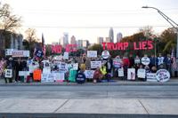 Protesters pose for a photo as they hold signs amid the arrival of federal law enforcement, Tuesday, Nov. 18, 2025, in Charlotte, N.C. (AP Photo/Matt Kelley)