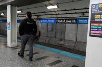 A Chicago police officer patrols the Clark Street and Lake Street Blue Line stop where a man doused a woman in liquid and set her on fire on the train Monday night, Tuesday, Nov. 18, 2025, in Chicago. (AP Photo/Erin Hooley)