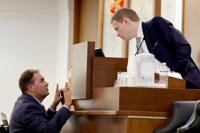 Speaker of the House Destin Hall, R-Caldwell, right, talks with Rep. John Bell, R-Wayne, left, during debate of a redistricting bill at the Legislative Building, Wednesday, Oct. 22, 2025, in Raleigh, N.C. (AP Photo/Chris Seward)