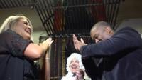 This photo taken from video shows Destiny Walker, left, and Larry Moss, right, celebrating after a judge married them at the Historic Jail and Sheriff's Residence on Friday, Oct. 31, 2025, in Delaware, Ohio. (AP Photo/Patrick Aftoora-Orsagos)