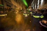Protesters shout in front of police line as they pour into the streets following Georgian Prime Minister Irakli Kobakhidze's announcement, rallying outside the parliament building in Tbilisi, Georgia, on Friday, Nov. 29, 2024. (AP Photo/Zurab Tsertsvadze)