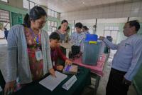 Officials of the Union Election Commission show a test slip of electronic voting machine as they prepare to set up a polling station opened at a school one day ahead of the first phase of the general election in Yangon, Myanmar, Saturday, Dec. 27, 2025. (AP Photo/Thein Zaw)
