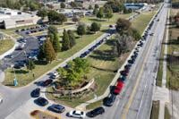 Cars line up for a pop-up food distribution event to provide extra support for Tulsa families affected by the recent lapse in SNAP benefits, at Food on the Move in Tulsa, Okla., on Thursday, Nov. 6, 2025. (Mike Simons/Tulsa World via AP)