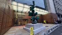 The scene at Aspen Insurance at Plantation Place in the City of London, after two activists sprayed red paint over the front of the building, in support of the Palestine Action protesters on hunger strike in prison, Tuesday, Dec. 23, 2025. (Shivansh Gupta/PA via AP)