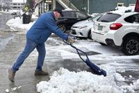 Bobby Searles shovels heavy, wet snow from a parking space outside the Cabot Village Store, Monday, Dec. 4, 2023, in Cabot, Vt. A storm dropped a mix of rain and snow on parts of New England, with some locations recording more than a half-foot of snow. (AP Photo/Lisa Rathke)