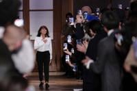 Designer Veronique Nichanian accepts applause after the Hermes Fall/Winter 2026-2027 Men's collection presented in Paris, Saturday, Jan. 24, 2026. (AP Photo/Aurelien Morissard)