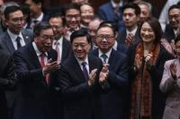 FILE - Hong Kong's Chief Executive John Lee Ka-chiu applauds with lawmakers following the passing of the Basic Law Article 23 legislation at the Legislative Council in Hong Kong on March 19, 2024. Hong Kong's leader said Tuesday, March 26, that prisoners convicted for serious national security crimes would not likely be granted early release under the tightened rules of a new national security law, signaling a hardening government stance against jailed political activists. (AP Photo/Louise Delmotte, File)