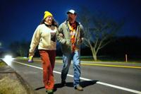 Graham Platner, Democratic candidate for U.S. Senate, and his wife, Amy Gertner, walk on the shoulder of the road while canvassing for a citizen's initiate on Election Day, Tuesday, Nov. 4, 2025, in Ellsworth, Maine. (AP Photo/Robert F. Bukaty)