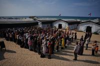 Students attend a morning assembly at a school set up on the beach in Khan Younis, southern Gaza Strip, Wednesday, Nov. 12, 2025. (AP Photo/Abdel Kareem Hana)